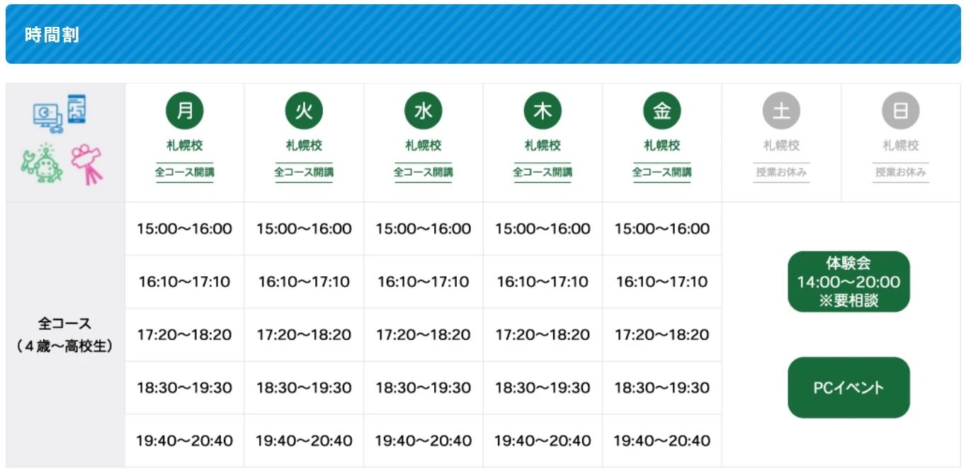 稲積公園駅には、プログラミングの他にも多様な習い事があります。対象年齢や料金を比較しながら選べます。